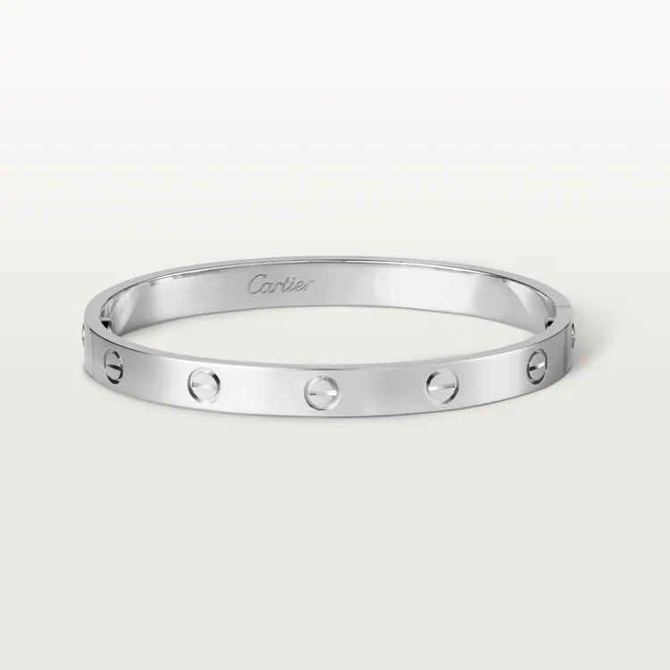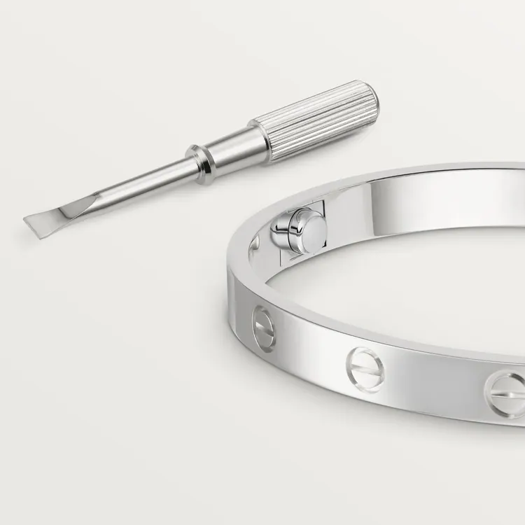 LOVE bracelet. white gold (750/1000). Comes with a screwdriver. Width: 6.1 mm. Created in New York in 1969. the LOVE bracelet is an icon of jewelry design: a close fitting. oval bracelet composed of two rigid arcs which is worn on the wrist and removed using a specific screwdriver. The closure is designed with two functional screws placed on either side of the bracelet: you will need help to open or close it. To determine the size of your LOVE bracelet. measure your wrist. adding one centimeter to your size for a tighter fit. or two centimeters for a looser fit.