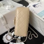 This Chanel Mini Square Pearl Embossed Flap Bag is crafted in apricot lambskin with antique silver hardware. It features a front flap with signature CC turnlock closure, tonal stitching, rear half-moon pocket, single interwoven apricot leather and antique silver chain link shoulder/crossbody strap with adjustable chain link “pearl” ball stopper.