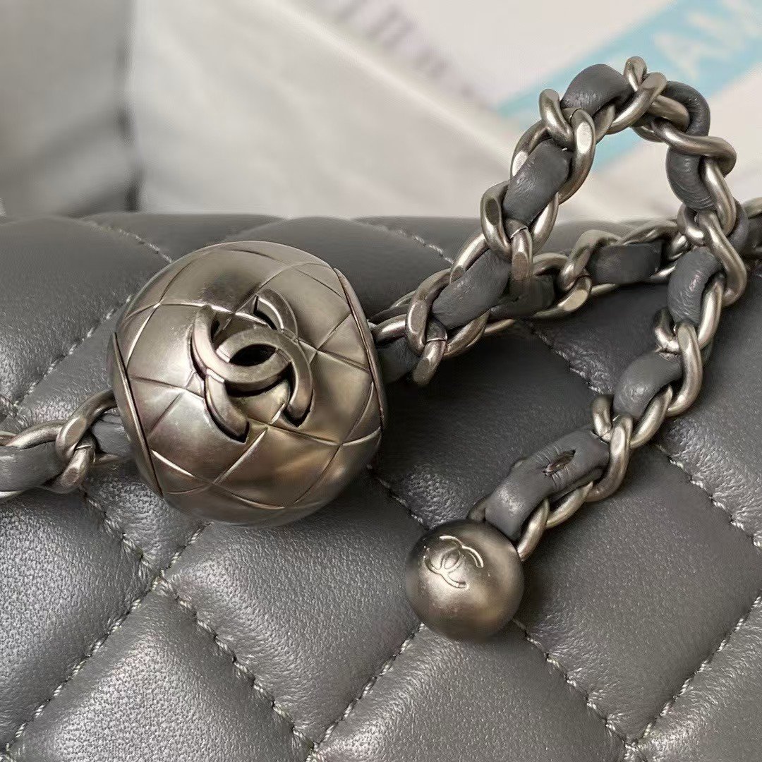 This mini rectangular pearl flap bag is crafted in dark grey lambskin with brushed silver hardware, front flap with signature CC turnlock closure, rear half-moon pocket, single interwoven dark grey leather and brushed silver chain link shoulder/crossbody strap with adjustable pearl ball.