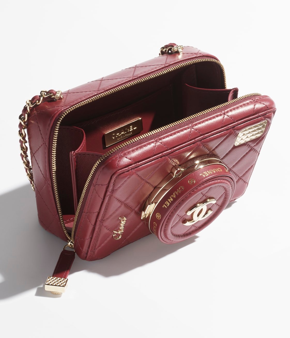 The new camera bag uses diamond quilted sheepskin to create a cute and playful camera shape. The “lens cover” is embellished with the classic double C logo. When opened, it is an exquisite and practical makeup mirror. There are 4 colors to choose from: black, white, dark beige and burgundy, and it comes with a signature leather chain shoulder strap.
