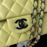 This medium classic double flap bag is crafted in yellow lambskin leather with gradient metal hardware, featuring the signature gradient metal CC turnlock closure on the front flap, half-moon back pocket, adjustable interwoven gradient chain and black leather shoulder strap.