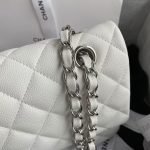 This medium classic double flap bag is crafted in white caviar leather with silver-tone hardware, featuring the signature CC turnlock closure on the front flap, half-moon back pocket, adjustable interwoven silver-tone chain and white leather shoulder strap.