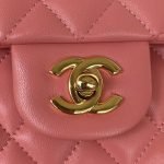 This medium classic double flap bag is crafted in dark pink lambskin with light gold hardware, front flap with signature CC turnlock closure, half-moon back pocket, adjustable light gold interwoven chain and dark pink leather shoulder strap.