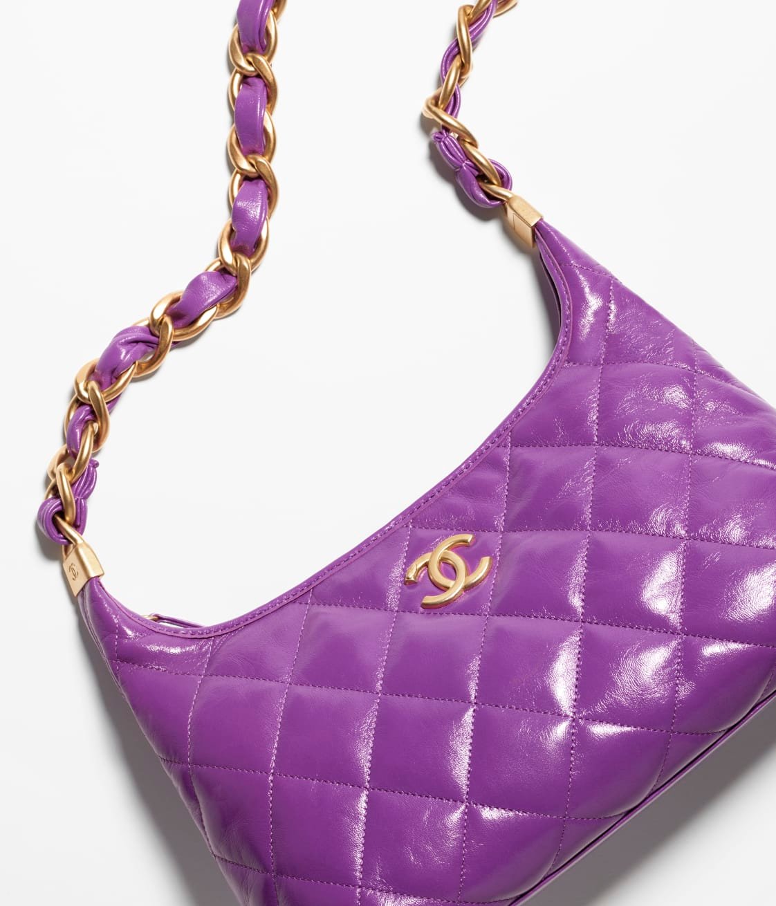 This Chanel Purple Quilted Shiny Crinkled Calfskin Hobo Bag features CC logo, shiny crinkled calfskin leather with a beautiful and luxurious feel, distressed/antique gold tone hardware. Lined with fabric. This bag is perfect for everyday use.