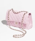 This Chanel Large Flap Bag is crafted from pink lambskin with brushed light gold hardware, front flap with large CC turnlock closure, half-moon back pocket, adjustable interwoven brushed light gold chain link and pink leather shoulder strap.