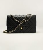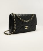 This large classic double flap bag is crafted in black lambskin leather with gold-tone hardware, front flap with signature CC turnlock closure, half-moon back pocket, adjustable gold-tone interwoven chain link and black leather shoulder strap.