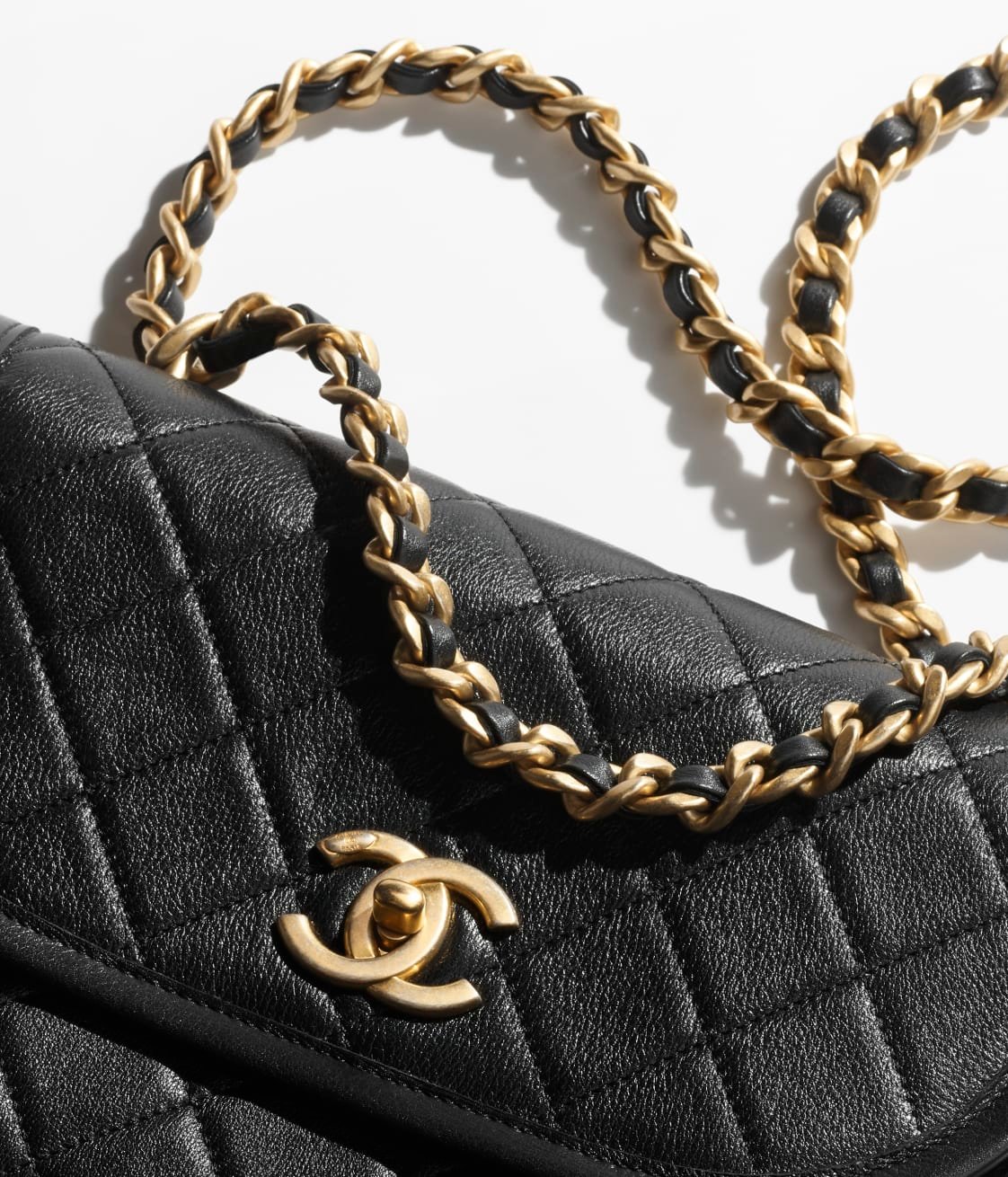 This flap bag is crafted from black quilted caviar leather with antique gold hardware and features a CC logo front flap, antique gold chain links and a black leather padded shoulder/crossbody strap.