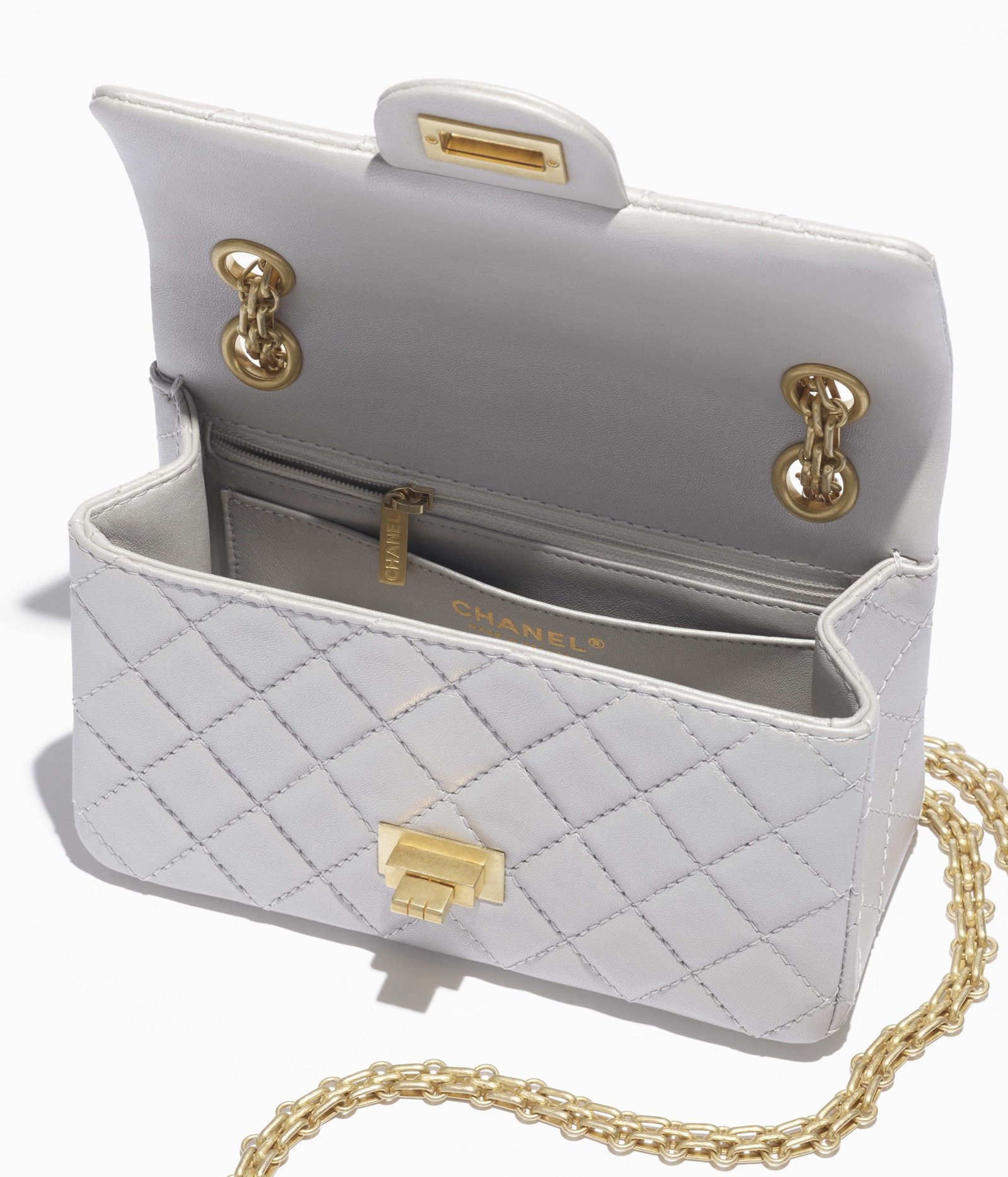 This Mini Reissue 2.55 single flap bag in light grey distressed calfskin with antique gold hardware features a front flap with a Mademoiselle turnlock closure, half-moon back pockets and interwoven gold chain links.