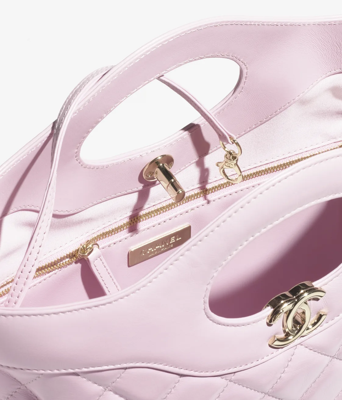 This Chanel 31 shopping bag is made of light pink lambskin with gold-tone hardware, cut-out top handles, magnetic snap closure, CC logo printed on the front and shoulder strap made of light pink leather and gold-tone chain links. The interior is lined with a light pink grosgrain and leather mix and has an open pocket on the back wall.