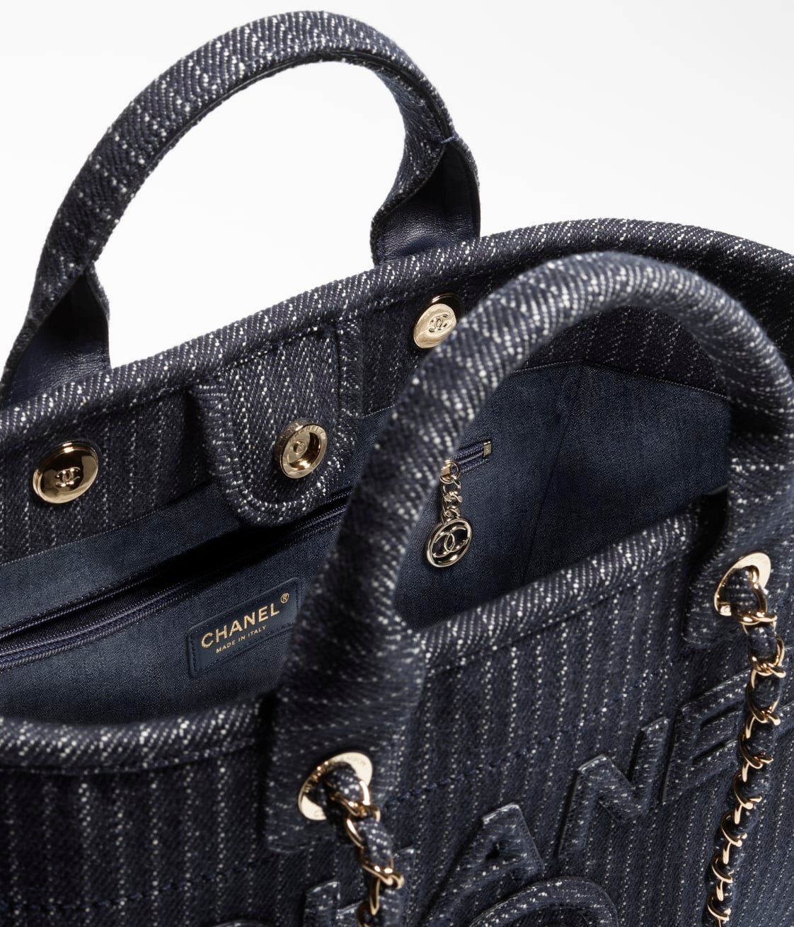 The interior is lined with blue fabric, with two open pockets on the front wall and a zippered pocket with a Chanel zipper on the back wall.
