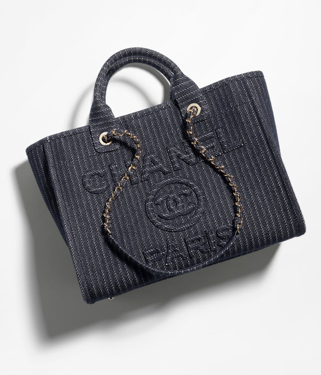The handbag is made of distressed blue denim with light gold hardware, a large CC and Chanel logo printed on the front, a removable pouch, two rolled top handles, two interwoven light gold chain links and a blue denim shoulder strap.