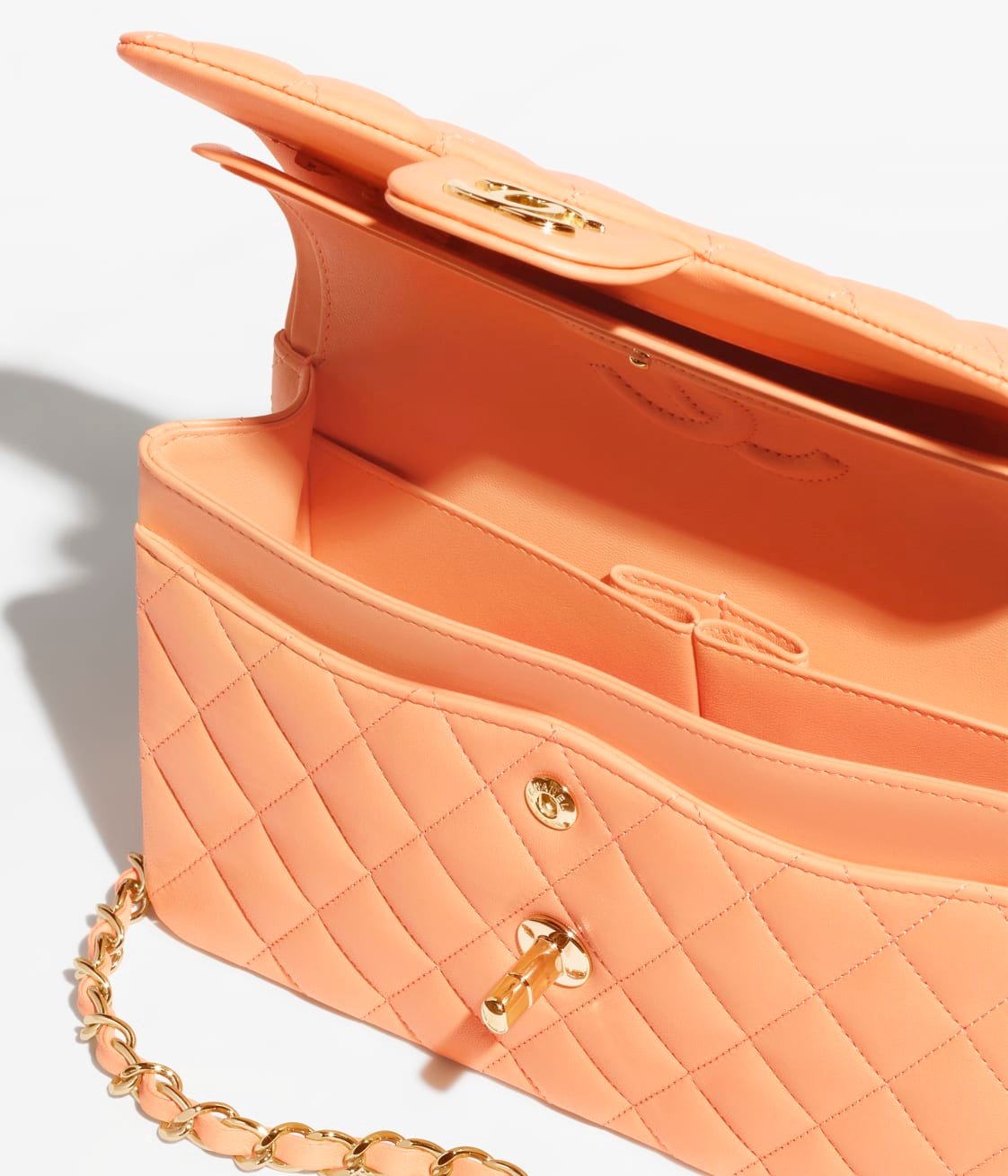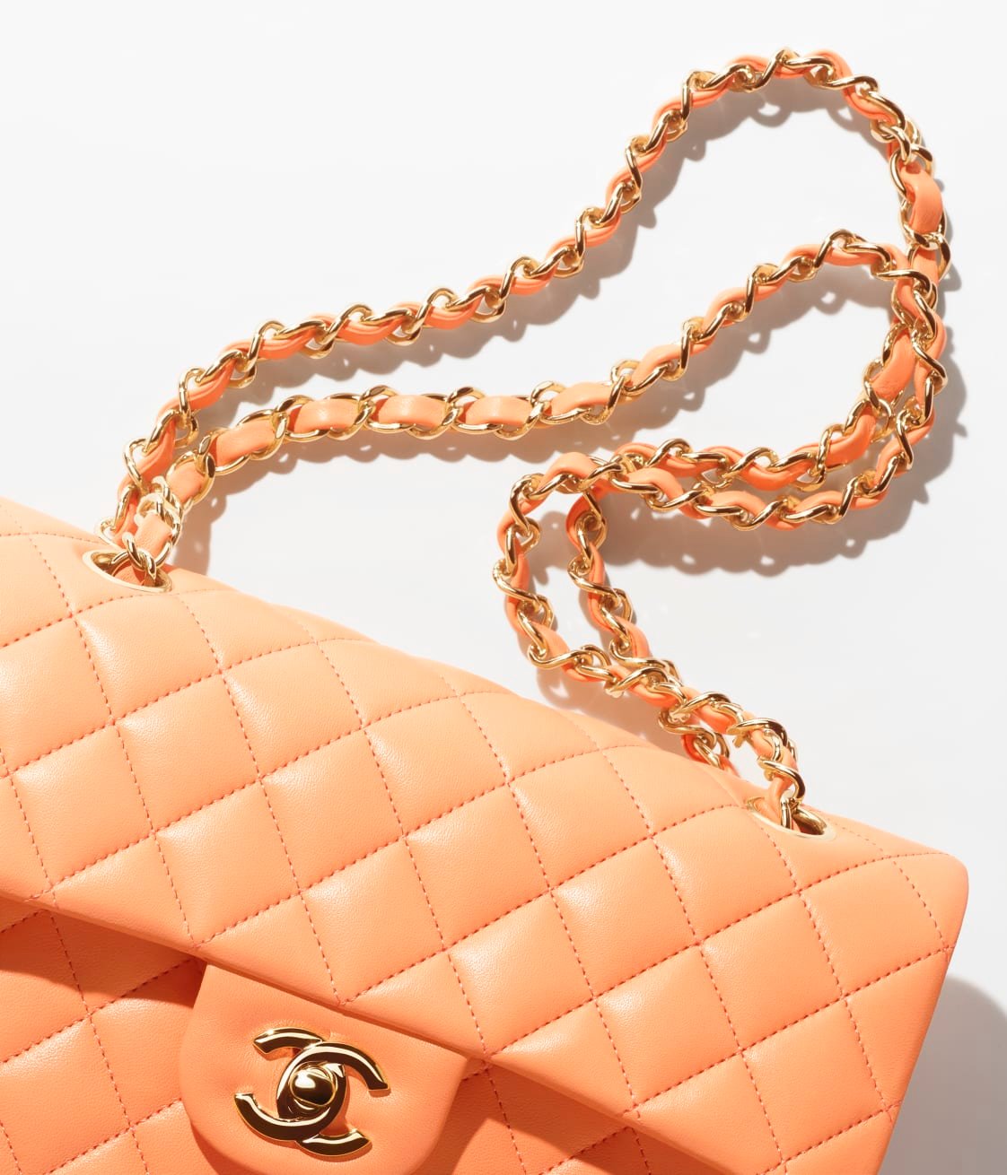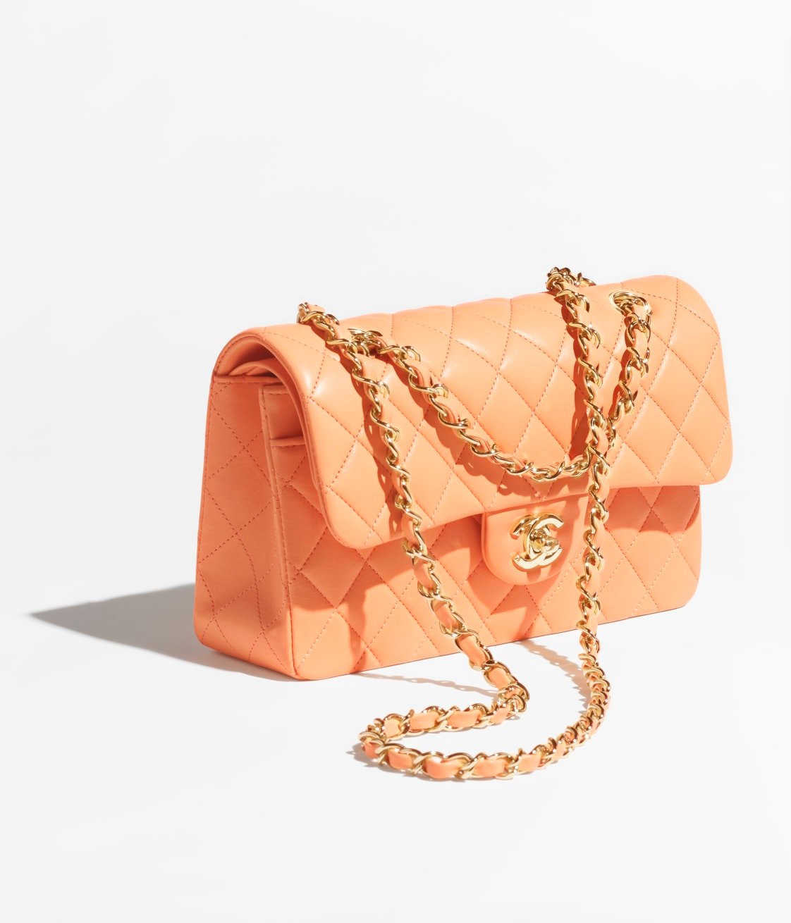 This Small Classic Double Flap Bag in orange lambskin with gold hardware, front flap with signature CC turnlock closure, half-moon back pocket, adjustable gold interwoven chain link and orange leather shoulder strap.
