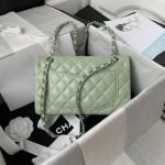 This small version of the classic double flap bag is crafted in light green caviar leather with silver hardware, front flap with signature CC turnlock closure, half-moon back pocket, adjustable interwoven silver chain and light green leather shoulder strap.