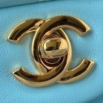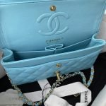 This small classic double flap bag is crafted in blue lambskin with light gold hardware, front flap with signature CC turnlock closure, half-moon back pocket, adjustable interwoven light gold chain and blue leather shoulder strap.