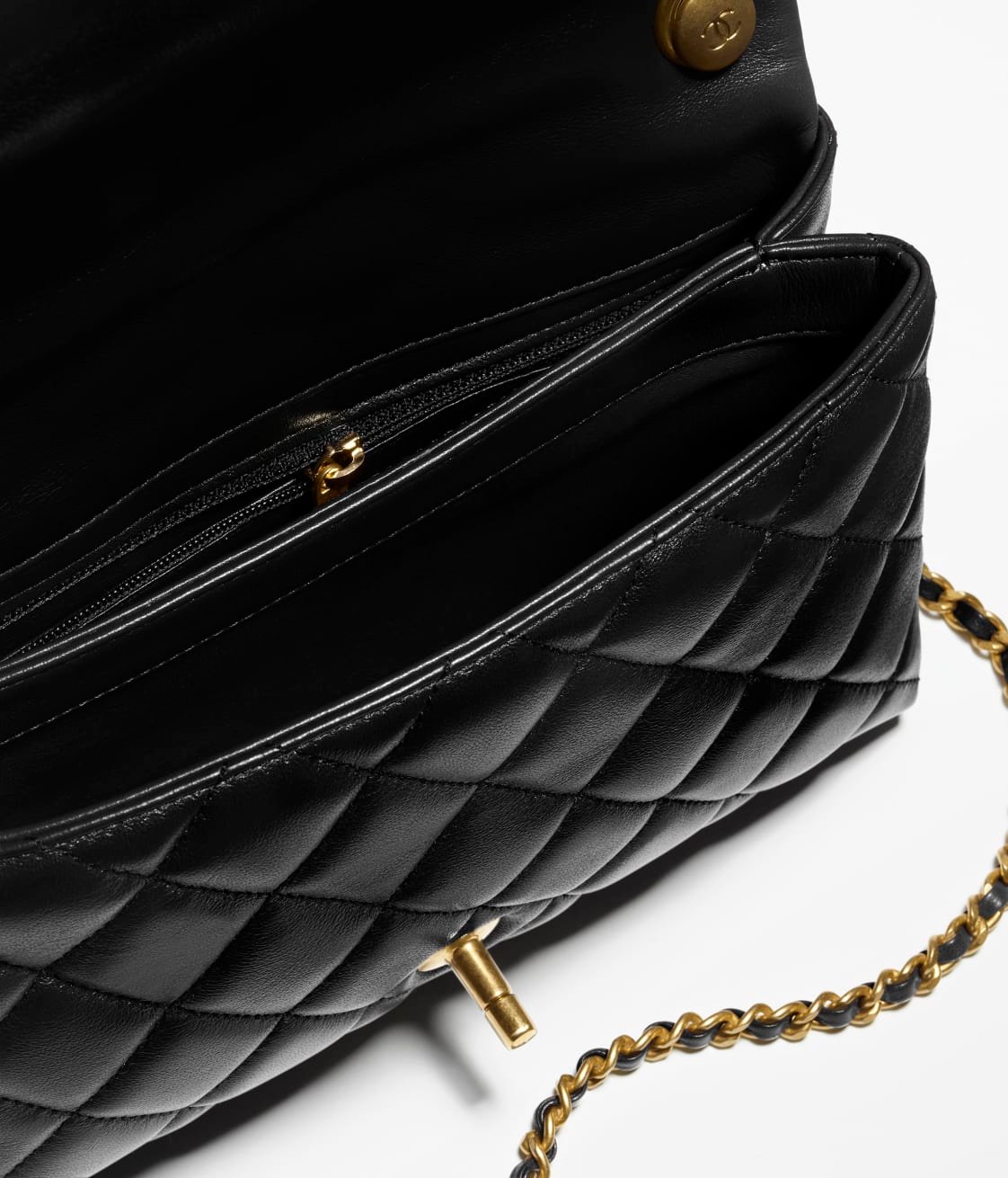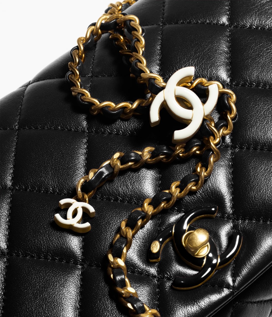 Small classic flap bag in black caviar leather with gold hardware, front flap with signature CC turnlock closure, half-moon back pocket, chain with colorful enamel buckle, adjustable gold interwoven chain and black leather shoulder strap.
