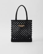 This tote bag with a summery mood reinterprets classic styles in crochet with a modern, sophisticated design. The light, roomy accessory is enhanced by a refined geometric motif inspired by the iconic Prada triangle, while the embroidered lettering logo in a contrasting color completes it with a distinctive touch.
