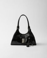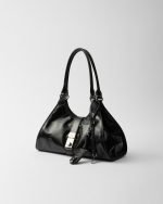 Geometric lines and refined artisan details define this bag with soft volumes. The trapezoidal silhouette features elongated handles to be worn with ease also as a shoulder bag. The vertical clasp inspired by the archives and the leather mirror complete the accessory with a sophisticated note.