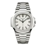 Stainless steel case with a stainless steel bracelet. Fixed bezel. Silvery white dial with luminous hands and index hour markers. Minute markers around the outer rim. Dial Type: Analog. Date display at the 3 o’clock position. Automatic movement. Scratch resistant sapphire crystal. Case diameter: 40 mm. Deployment clasp. Water resistant at 120 meters / 400 feet. Functions: hour, minute, second. Luxury watch style. Watch label: Swiss Made. Patek Philippe Nautilus Silvery White Dial Stainless Steel Mens Watch 5711-1A-011.