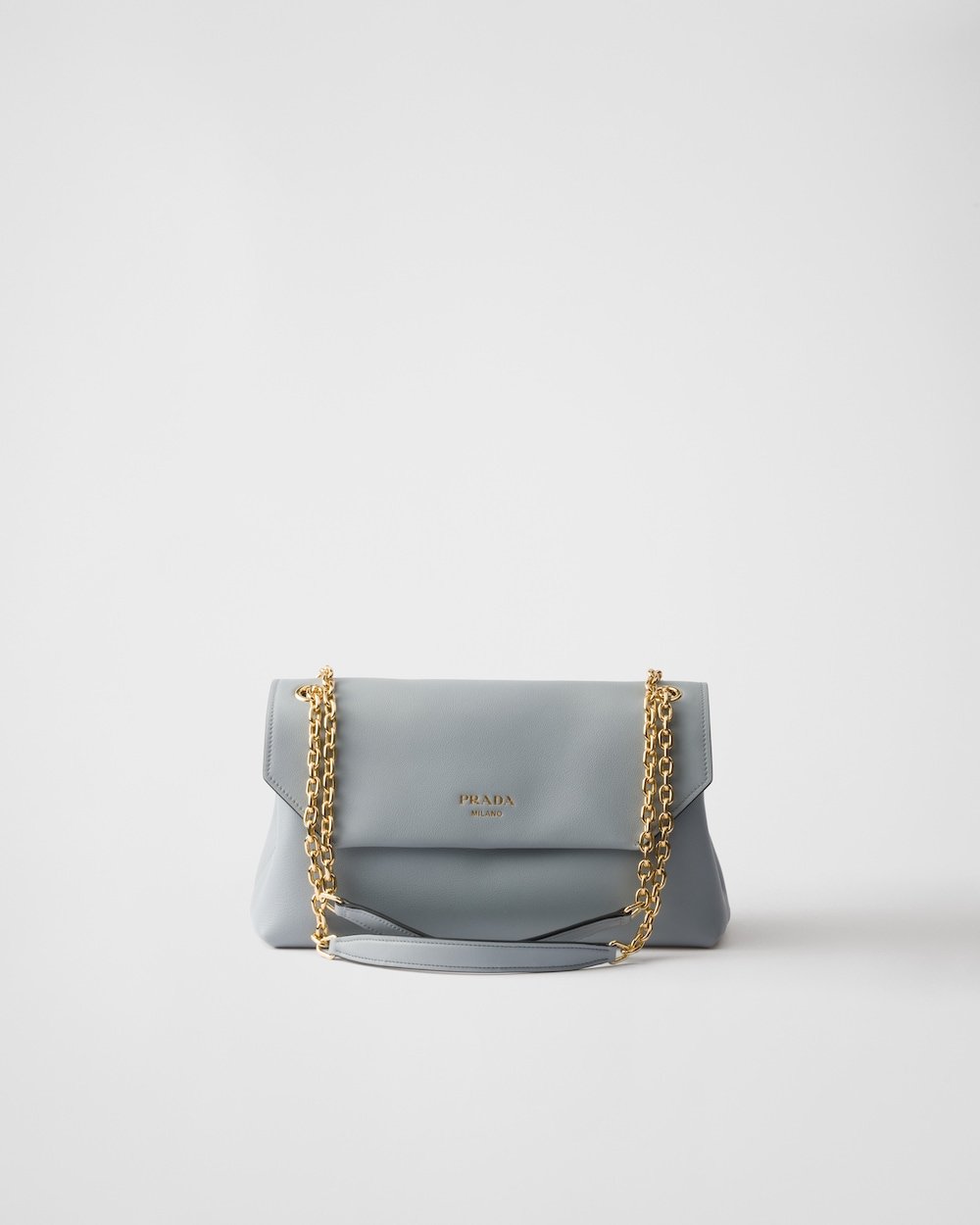 This refined and pragmatic shoulder bag combines details with timeless elegance and a silhouette with contemporary volumes emphasized by the soft touch of leather. The style is characterized by sliding chain handles, nappa leather interior, and back pocket. The accessory illuminated by metal hardware is decorated with the elegant lettering logo embossed on the flap.